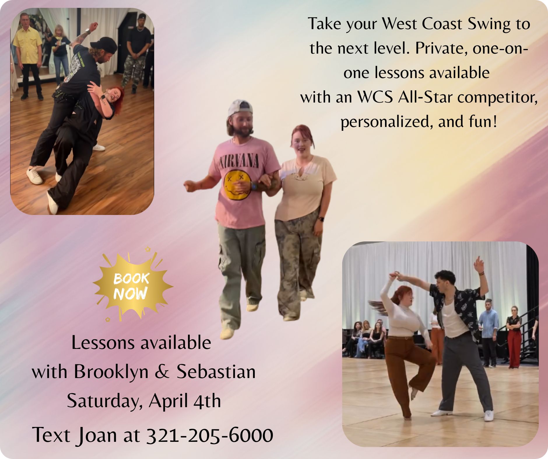 📅 Date: Saturday, April 4th, 2026 Take your West Coast Swing to the next level!! Private, one-on-one lessons available with Sebastian and Brooklyn, a WCS All‑Star competitor! One-on-one lessons available prior to the event 📞 Text Joan at 321-205-6000 today! Don’t miss this chance to learn from two incredible dancers! |