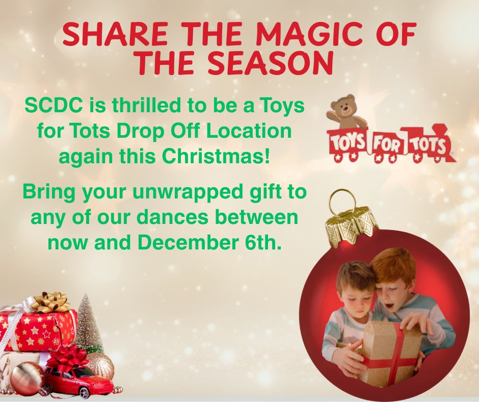 SCDC is proud to be an official Toys for Tots drop-off location again this season. π Bring a new, unwrapped toy to any of our dances between NOW and DECEMBER 6th to help make a childβs Christmas brighter. Every gift makes a difference β letβs dance, give, and share the joy together! |